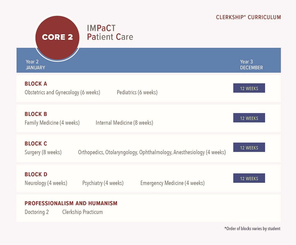 - Block C: Surgery (8 weeks), Specialty Services (Orthopedics, Otolaryngology, Ophthalmology, Anesthesiology) (4 weeks)